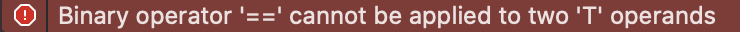 value == valueToFind 구문으로부터 발생하는 오류로 swift의 모든 타입이 저렇게 == 라는 여산자로 비교될 수 있는 것이 아니기 때문에 발생하는 에러이다. 즉, swift가 가능한 모든 타입 T에 대해 이 코드가 작동한다는 것을 보장할수 없기 때문에 컴파일 에러가 발생하는 것이다!